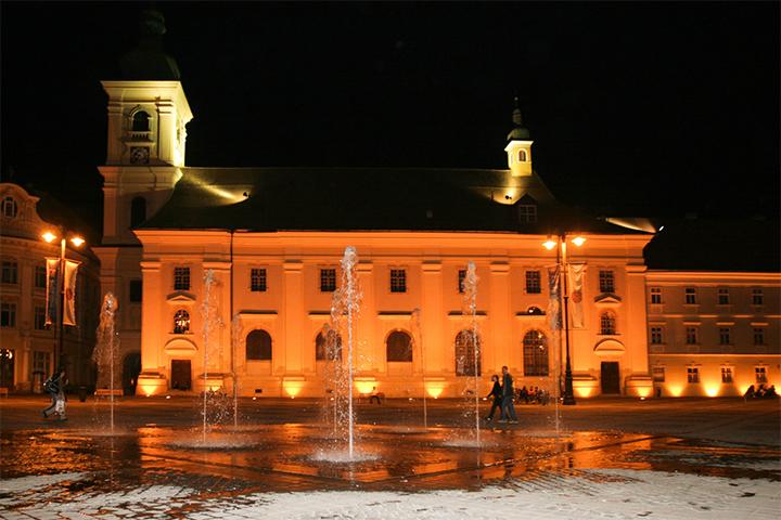 Поэтому кажется, что здание дружелюбно рассматривает тебя. На улицах Сибиу хорошо провести теплый осенний или весенний вечер. Сначала садящееся солнце придает желтоватым стенам старых домов теплый оттенок, затем постепенно начинает включаться подсветка площадей и зданий.