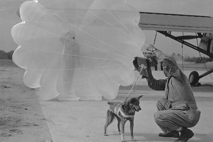 А вот во время Первой мировой и на первом этапе Второй мировой, до массового распространения переносных раций, существовала специализация собаки, переносящей клетки с почтовыми голубями, так сказать собака-голубятник! С появлением воздушно-десантных войск свои парашюты получили и приписанные к этим подразделениям четвероногие разведчики.