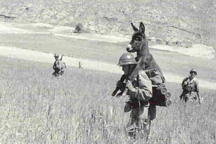 Конечно, лошадей в армии старались беречь. Не всегда потому, что их любили и жалели. Но даже для самого бездушного возницы лошадь была ценным казенным имуществом, за которое он отвечал. Того, кто не справлялся со своими обязанностями и зазря загубил животину, могли отправить на передовую в пехоту, даже в штрафбат. Но самым большим наказанием были последствия потери коня. Кавалерист превращался в бесполезного бойца, бегом нагоняющего своих товарищей. Артиллерийский расчет без упряжки не мог быстро сменить позицию и становился легкой мишенью для противника. Без лошади нельзя было эвакуировать раненых, доставить в окопы боеприпасы, обед. До появления техники лошадь была совершенно незаменима и в мирной жизни, и на войне, и была практически единственным животным, которое если не любили, то уж точно уважали. Нередко боевой конь ценился дороже солдата! Хотя, к сожалению, лишь до тех пор, пока лошадь можно было эксплуатировать. Поэтому с давних времен использовались различные методы защиты боевых и обозных лошадей. Например, с конца 19 века драгун, для ведения внезапного стрелкового боя, тренировали спешиться, положить коня на бок, залечь за него самому и вести огонь. В годы Первой мировой для лошадей выпускали различные модели противогазов, а с появлением иприта даже одевали в костюмы химзащиты. Также в ходе войн 20-го века для лошадей, служивших на передовой, сооружали специальные укрытия: это могли быть как открытые капониры, так и лошадиные блиндажи-конюшни. Кстати, вот вам и еще одна причина, по которой использование осликов в окопах было выгоднее – ведь для них были нужны укрытия меньшего размера. Вообще, не смотря на ошибочный имидж недалекого но упрямого животного, ослики на военной службе быстро заводили себе друзей среди людей, и их очень любили. Вот, кстати, известная фотография 1958 года: солдат 13-й бригады французского Иностранного легиона несет на себе осленка. Конечно, версия о том, что он переносит его через минное поле, оказалась просто красивой сказкой. Но и правда тоже вызывает самые добрые эмоции: во время рейда солдаты наткнулись на брошенного ослабевшего осленка, и не оставили его, а донесли до своей базы и выходили, где он и прослужил несколько лет.