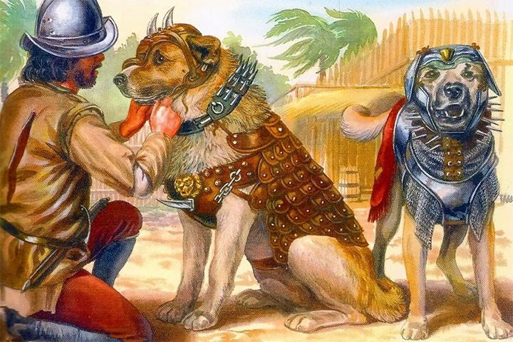 Собака была первым животным, призванным человеком на службу. Вначале она лишь помогала своим хозяевам на охоте, потом охраняла их имущество и стада – чем собаки успешно занимаются и по сей день. Но военная карьера собак началась уже с первыми межплеменными столкновениями. Они чуяли приближение чужаков, а в стычках не оставались в стороне, защищая своих хозяев. Постепенно из собак-охранников выделились настоящие боевые псы. Первые упоминания о них относятся к египетскому Новому Царству (13 век до н.э.), затем они появились в Месопотамии. Основатель Персидской империи Кир Великий создал в армии отряды боевых псов, защищенных в специальные доспехи. Его сын Камбис II вторгся с ними в Египет (где столкнулся с боевыми псами египтян), при Дарии I они приняли участие в Марафонской битве, а при Ксерксе пытались прорвать строй спартанцев у Фермопил. Греки достойно оценили противника, и решили тренировать для сражений собственных собак, ранее служивших лишь охранниками и следопытами. Но пастушьи собаки оказались слабоватыми для схваток, поэтому греки стали разводить трофейных персидских догов (так появилась порода молосских догов). Боевые псы воевали в рядах армий царя Пира и Ганнибала, а у древних германцев они ценились вдвое дороже кавалерийского коня! В битве в Тевтобургском лесу, где были уничтожены три легиона Квинтилия Вара, римских солдат опрокидывали огромные волкодавы в кожаных доспехах и ошейниках с длинными острыми шипами. Однако самих римлян идея взять на вооружение боевых псов почему-то не заинтересовала, хотя у них была возможность создать самую грозную в истории собачью армию. Отметим, что точно так же римляне долго игнорировали создание собственной тяжелой кавалерии – даже когда проиграли ряд сражения парфянским катафрактариям.