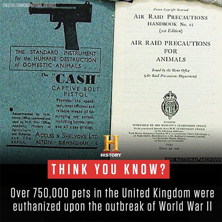 Но если в СССР собаки-истребители гибли хотя бы в бою с врагом их хозяев, то в Великобритании сотни тысяч владельцев собак и кошек решили просто избавиться от них, как от обузы и лишних ртов. Началось все еще летом 1939-го, когда Вторая мировая еще не началась, но британское правительство уже начало готовиться к воздушным налетам противника. На волне этой подготовки был создан Национальный комитет противовоздушной обороны животных (National Raid Precautions Animals Committee - NARPAC). Задумка была благой: предотвратить появление множества бездомных кошек и собак, владельцы которых, спасаясь от бомбардировок, бросили бы своих домашних питомцев на улице. Ведь такое уже случилось во время Первой мировой, после налетов немецких дирижаблей. Однако исполнение задумки вылилось в чудовищную трагедию. В первые дни войны NARPAC распространил в больших городах брошюры для владельцев домашних животных с советами либо отвезти их в деревню, либо… усыпить. Под якобы благим предлогом «спасти их от возможной трагедии», а так же чтобы животные не объедали своих хозяев и британскую социальную систему. К брошюре даже прилагалась реклама специального «пистолета для гуманного усыпления», простреливающего голову любимого песика или кошечки, дабы не обременять себя визитом к ветеринару.