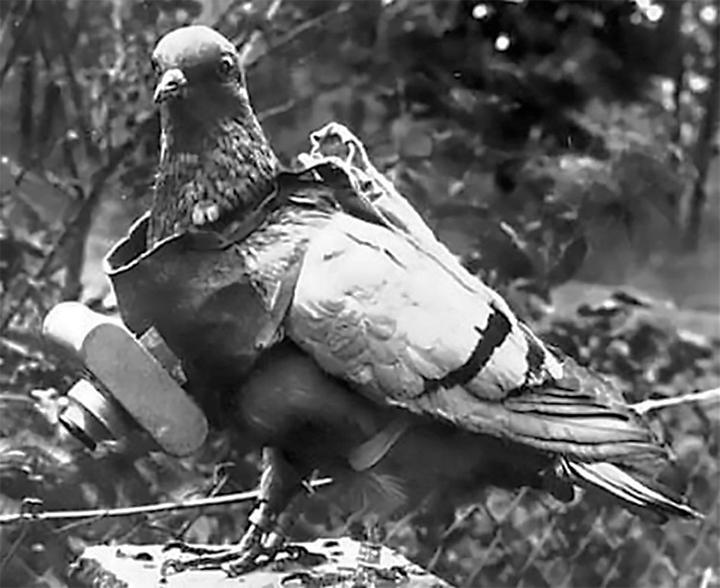 В 1912 году голуби освоили новую военную профессию – воздушного разведчика. Немецкий изобретатель Юлиус Нойброннер создал для них миниатюрную автоматическую фотокамеру, которая крепилась к груди птицы. Превосходная цейсовская оптика и специальная микропленка (использовавшаяся также в шпионских фотоаппаратах) позволяли делать два-три десятка снимков местности, над которой пролетал голубь. Потом снимки распечатывали – и вот вам данные аэроразведки местности, укреплений и крепостей, целых городов! Но большого применения голуби-разведчики не имели. Во-первых, использование голубей сопряжено с главной трудностью: сначала птицу со своей станции (гнезда) необходимо переправить тому, кто затем выпустит ее обратно с почтой или фотокамерой. В условиях обычной, прямой связи, голубиная почта работает исправно. А если нужно отправить послание из тыла противника? Ведь переправить туда голубей через линию фронта очень сложно (для этого, в частности, и использовали собак). Поэтому в воздушной разведке голубей вскоре заменили аэропланы.
