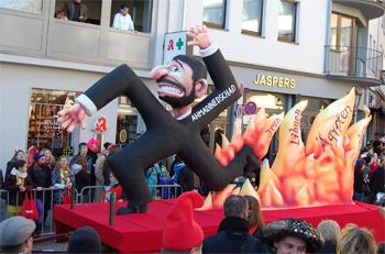 На живописных платформах машин, проезжавших вдоль разукрашенной, поющей и кричащей "дурацкой" толпы, политическая реакция на то, что волнует сегодня немцев как у себя дома, так и вокруг. И, вполне естественно, что главными объектами ехидных издевок и подчас довольно злых насмешек на нынешнем Карнавале шутов практически во всех пунктах праздника стали как внутригерманские герои и сюжеты, так и внешнеполитические персонажи и катаклизмы, безусловно, влияющие на немецкую жизнь…
