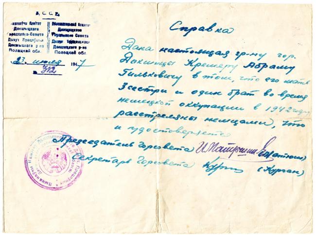 На фото автора и Анатолия Якуба: профессор Илья Альтман; справка об уничтожении нацистами евреев в г. Докшицы.