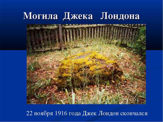 Писатель умер 22 ноября 1916 года в городке Глен-Эллен (Калифорния). Пепел похоронен в Историческом Парке Джека Лондона там же, в Глен Эллен. На могиле стоит только валун, поросший мхом.