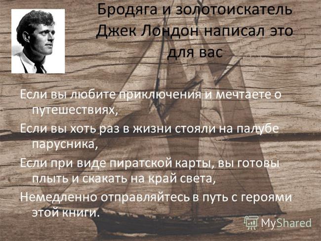 Джека манил морской простор, который открывался тут же за кромкой пристаней и портовых сооружений Сан-Франциско. Иммигранты толпами высаживались на благодатном калифорнийском берегу. Романтика портовой жизни захватила подростка. Он был принят в среду «устричных пиратов», которые занимались контрабандой и другими темными делами. После душных цехов, где он проводил долгие часы за станком среди усталых и подавленных тяжким трудом людей, жизнь «устричных пиратов» показалась Лондону необыкновенно привлекательной. Но у юноши появляется мечта о «высокой цели», во имя которой ему хочется жить и действовать. И вот Джек Лондон – семнадцатилетний матрос шхуны «Софи Сазерленд», идущей в Берингово море за котиками. Шхуны уходили с вооружением, иногда несли на борту пушки. У Командорских островов, в водах Чукотки и Камчатки бывали бои с русскими судами, о которых всему миру поведал Киплинг, любимый поэт Джека. Тогда ему пришлось кулаками завоевывать себе уважение и место среди экипажа – суровых моряков-скандинавов и доказывать, что он может пить и веселиться в японских чайных. Деньги, заработанные тяжким трудом моряка, он отдал матери, далее он начал работать на джутовой фабрике.