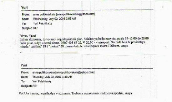 Фотокопии имейлов Анны Политковской Юрию Фельштинскому о встрече в Лондоне и о смерти Юрия Щекочихина