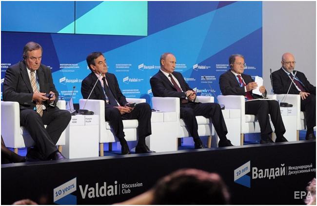 Встреча Путина с членами Международного дискуссионного клуба "Валдай" в сентябре 2013 года. На снимке (слева направо) бывший министр обороны Германии Фолькер Руэ, бывший премьер-министр Франции Франсуа Фийон, президент России Владимир Путин, экс-премьер-министр Италии Романо Проди и президент Центра National Interest Дмитрий Саймс. Фото: ЕРА