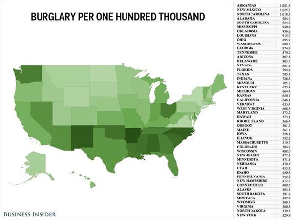 К примеру, краж со взломом (на 100 тысяч населения) на республиканском юге и даже в обеих Каролинах с Оклахомой втрое больше, чем в эталонно-либеральном, наиболее эмигрантском штате Нью-Йорк. И почти вдвое больше, чем в Калифорнии, где белых немногим более половины населения, а почти 40% это опасные и преступные латинос. Которых тако не корми, текилой не пои - все равно норовят накриминальничать по самое сомбреро…