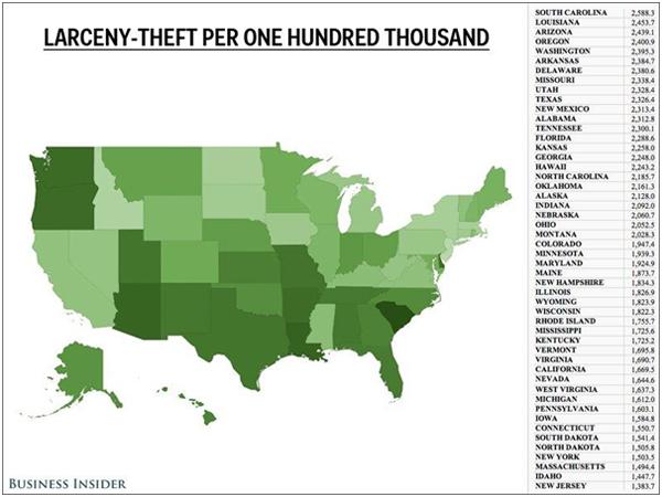 Похожая картина и с воровством. В крайне распущенном Нью-Йорке, где глаз надо держать востро, а квартиру на хорошем замке, таковых около полутора тысяч в год (на 100000 чел.), что крайне неприятно и возмутительно - как можно жить, не доверяя людям!? Но вот какой казус, в богобоязненной Луизиане хищений гораздо больше. Вы скажете, что там много черных, вот и результат? Гм. Но почему тогда лидирует по этому показателю вполне белая и насквозь республиканская Северная Каролина? Да и Техас отнюдь не пасет задних насчет чего-нибудь стибрить (10 место) и даже мормонская Юта не славится честностью (9 место). Зато переполненная мексиканцами Калифорния на 38-м, а штат Нью-Йорк вообще на 47-м месте. В итоге и здесь в первой десятке самых вороватых - 8 красных штатов. Так у кого более высокие моральные принципы, у белых протестантов с их религиозностью или у всяких легально и нелегально понаехавших?