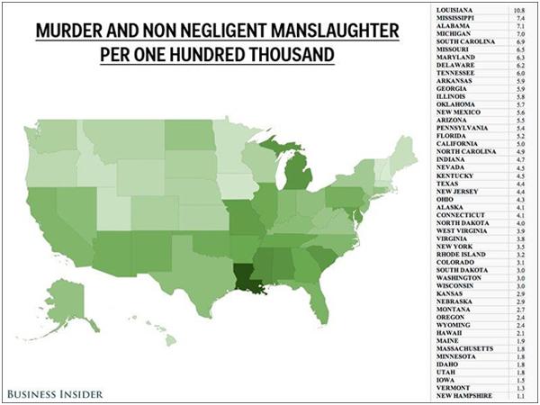 Далее идет самый кровавый круг криминальных разборок: убийства. В том числе убийства по неосторожности, что в стране, переполненной оружием, вносит существенный вклад в общую статистику. Хотя для столь вооруженной страны убийств удивительно мало и даже лидирующей с большим отрывом Луизиане не угнаться за Россией. И тут перевес на стороне республиканских штатов - их снова 8 в первой десятке.