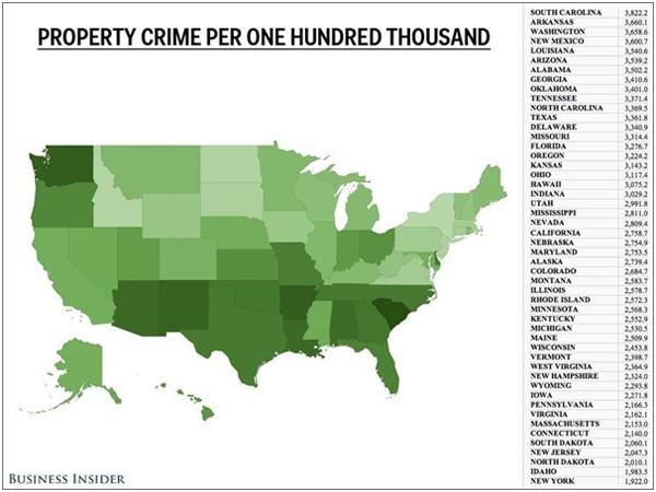 Что еще? Ах да, мы упустили чрезвычайно важный для Америки момент, покушения на святое, преступления, связанные с собственностью! Но тут все просто - одно дело провозглашать святость моральных принципов и совсем другое придерживаться их. Самый порядочный в этом отношении штат - Нью-Йорк, он замыкающий таблицу, а возглавляют ее сплошь красные штаты, начиная с Арканзаса, и если бы не Вашингтон (не столица, штат), портящий красивую картину, то можно было бы заметить очевидное неуважение к собственности в южных штатах.
