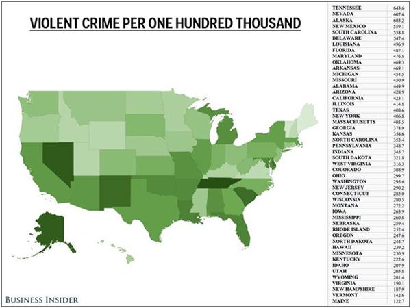 И раз уж речь зашла об этом известном на весь мир анклаве, то самое время перейти к преступности, ибо известна и доходящая до расизма нелюбовь "наших" к черным, которые вместе со всякими понаехавшими, особенно мусульманами, губят великую страну. Да, казалось бы, криминал должен процветать там, где много черных, этих бездельников-вэлферщиков, много эмигрантов и наркотиков, где слабы позиции религии, а значит и морали, где у власти развращенные и расхлябанные демократы. То есть в штатах именно винных, городских, либеральных.