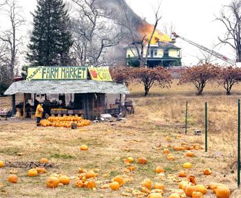 Или вот одна из самых известных фоторабот Джоэля Стернфельда - пожарник, покупающий у торговца тыкву, на переднем плане - огромные апельсиново-яркие тыквы, а на заднем полыхает дом. Яркие тыквы корреспондируются с осенними красками сельской местности и иронически (даже как-то ехидно) контрастируют с пламенем горящего дома...
