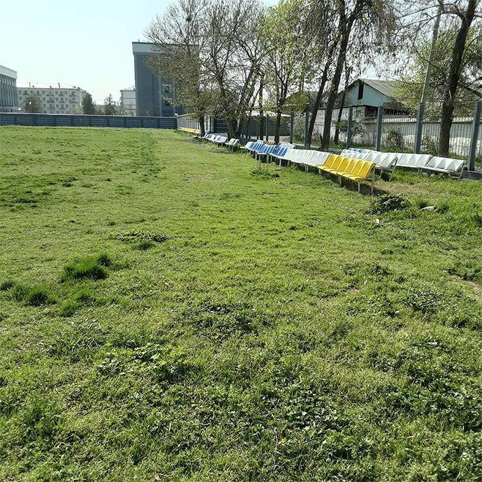 На противоположной от трибун стороне есть два длинных ряда пластиковых стульев. Стулья закреплены на общем каркасе на металлических трубах. Ряды стоят не параллельно, а последовательно, в продолжение друг друга, но с разрывом, заполненном баннерами. Причём установлены так, что граничат с беговой дорожкой (на снимке она тёмно-зелёного цвета). На этих сиденьях располагаются команды (вместе с тренерами и другими лицами), ожидающие своей очереди выхода на поле. Понятно, что не все сидят чинно и терпеливо на стульях: встают, ходят туда-сюда по беговой дорожке, а то и вовсе присаживаются на корточках. То есть та сторона совсем неудобна для утреннего бега.