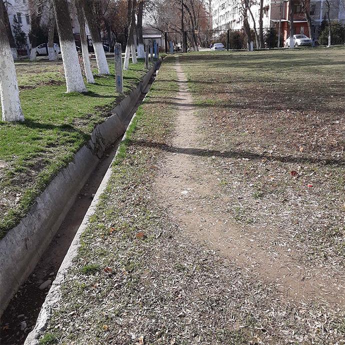 И вот 23-го марта я заметил бегающих двух мальчишек по периметру бывшего моего пустыря с внешней стороны ограждения. Неужто мини-поле не примыкает к глухому забору территории, воздвигнутому во время реконструкции, а там есть какая-то дорожка?! Надо проверить! Направился туда – и точно: есть пространство, пусть узкое, пусть бетонированное, но вполне годное для бега. Прошёл вдоль стены до конца. Завернул налево. Там коридор между ограждением мини-поля и деревьями довольно широкий. И грунтовый, как прежде. Прошёлся до следующего поворота налево. Там тоже весьма широкое пространство (мелкая щебёнка) между ограждением мини-поля и прямой, длинной канавой в бетонных лотках. Та самая канава, которая видна на снимке с моей тропой по сторонам тогдашнего моего пустыря (снимок дан выше).